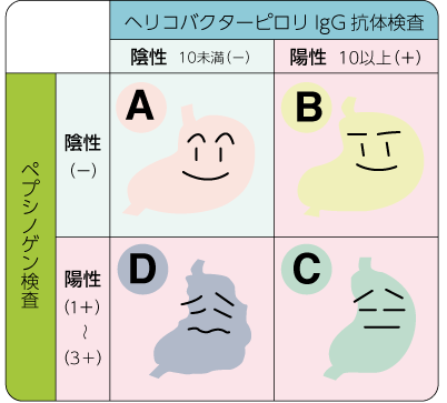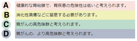 胃がんリスク健診(ABC健診)は『 ヘリコバクター・ピロリ菌(通称ピロリ菌)感染の有無を調べる検査 』と『 胃炎の有無を調べる検査(血清ペプシノゲン値によって測定する胃粘膜の委縮度) 』を組み合わせて、胃がんになりやすいか否かをリスク(危険度)分類するものです。