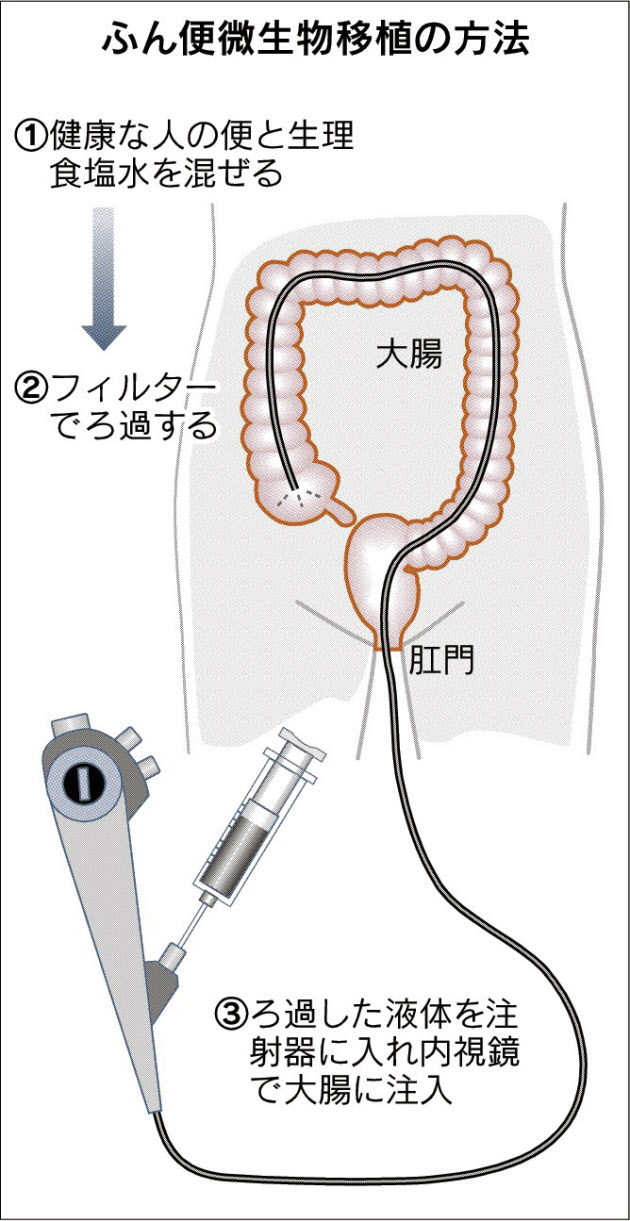 研究グループは難治性の偽膜性腸炎にCDに有効な抗生物質を投与するのと同時に、健康な人の糞便を水に溶かし、残渣を濾し採った液を口からチューブを入れて小腸に注入するという方法で多くの改善をみたという。